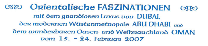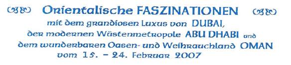 DUBAI - OMAN vom 15. - 24.02.07 ..... wir sind mit unserer tollen Reisegruppe von dieser traumhaften Reise wieder zurück ..... Das faszinierende DUBAI, Abu Dhabi mit dem weltbesten und schönsten 7-Sterne-Hotel "Emirates Palace", wo wir zu Kaffee und Kuchen eingeladen waren u n d der OMAN, ein Land wie aus "Tausend und einer Nacht" u n d gewohnt haben wir nur in den besten Hotels ......... Eine Luxusreise vom Feinsten !!!