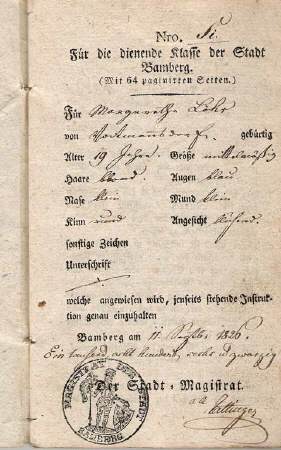 *) Da hätte Margareth 1807 geboren sein müssen. Ihr Taufzeugnis hingegen weist als Geburtsjahr 1810 aus. Sie war also 16 als sie registrierte Dienstmagd wurde. Sie hat sich "älter" gemacht, vermutlich um arbeiten zu "dürfen".