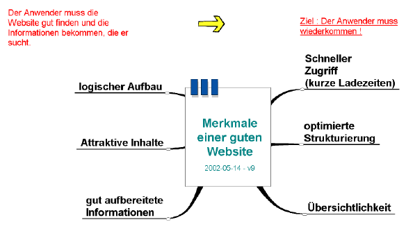 Nach Abschluss der Klärung der Anforderungen und deren Festschreibung muss eine dem Auftragszweck adäquate Website konzipiert werden, die gewissen Merkmalen gehorcht. Diese Merkmale haben sich aus den Erfahrungen im Umgang mit Websites herausgebildet. Dabei spielen nicht Möglichkeiten des (technischen) Webdesigns eine Rolle, sondern schlicht die Akzeptanz beim Besucher der Website (= Kunden). |
