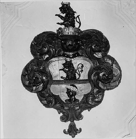 Wappen im Unteren Schloß (aufgenommen 1962) ( Im Wirtssaal des Unteren Schloßes befand sich unter der Decke ein holzgeschnitztes Wappen der Zollner vom Brand. Jetzt nicht mehr vorhanden )