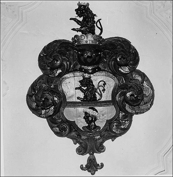 ![]() Wappen im Unteren Schloß (aufgenommen 1962) ( Im Wirtssaal des Unteren Schloßes befand sich unter der Decke ein holzgeschnitztes Wappen der Zollner vom Brand. Jetzt nicht mehr vorhanden ) |